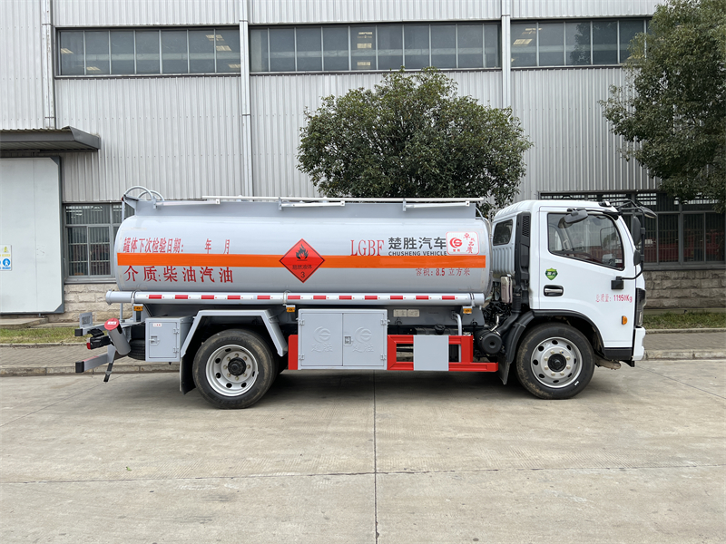 上裝配置:公告容積8.5立方,單倉帶溢流閥80-60泵,全套歐標(一個歐標罐口,一個海底閥,一個防溢流探桿及插座、一個廢氣回收、一個下裝油口)智能海底閥。大流量加油機及卷盤,升降護欄。配一個防火帽,兩根等長的輸油管及陰陽端,兩個滅火器,兩個堵頭,帶后爬梯,鋼絲網走道,一個工具箱,安全告示牌,其它標配。保證整車外形尺寸、罐體尺寸、外形與公告一致(3)油漆:銀粉色,貼反光條,反光帶,反光板,三個“易燃液體”字